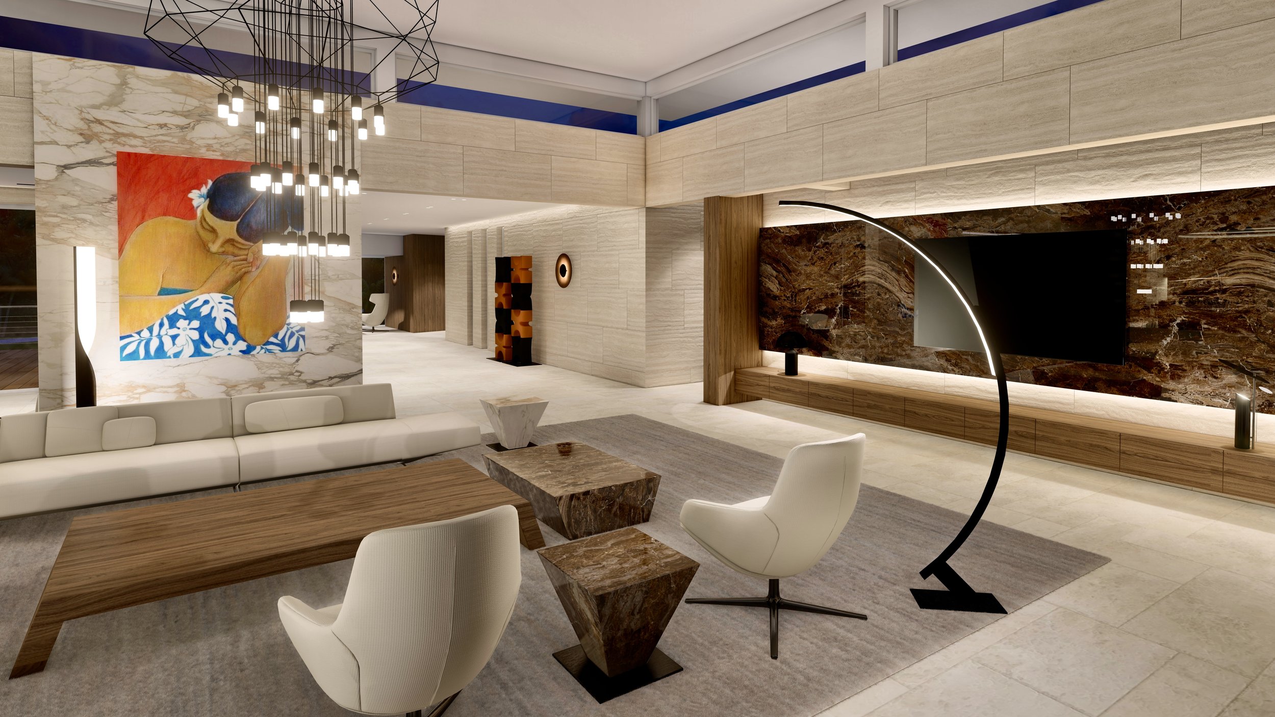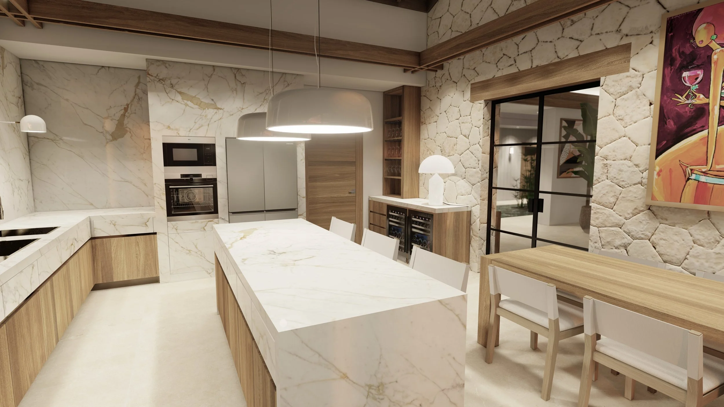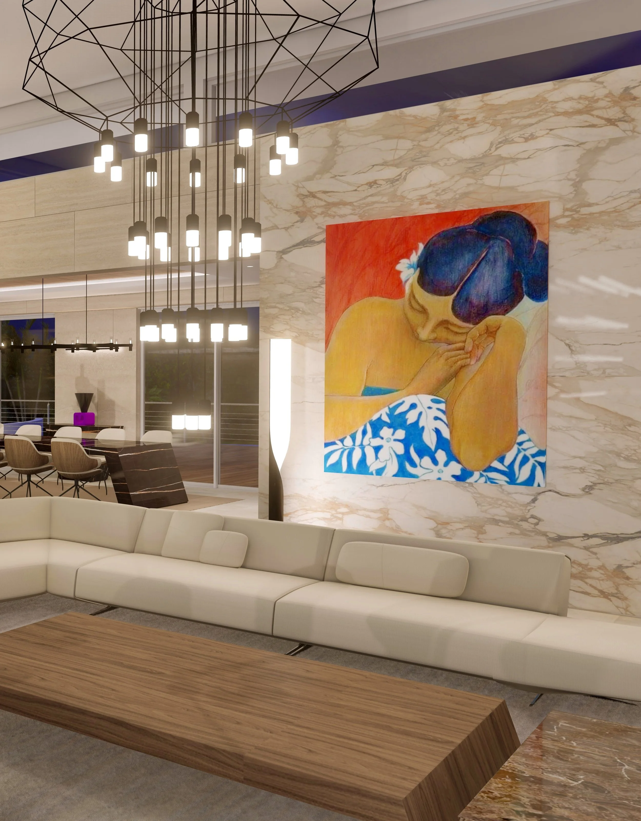 Les marbres brun Frappuccino, ivoire Calacatta vena vecchia, et les essences de bois clairs composent une toile apaisante, rythmée par des contrastes forts comme le marbre noir Sahara des îlots et de la table monumentale. Les œuvres d’art, aux couleurs vibrantes et aux accents polynésiens, insufflent une dimension culturelle et émotionnelle à l’espace.