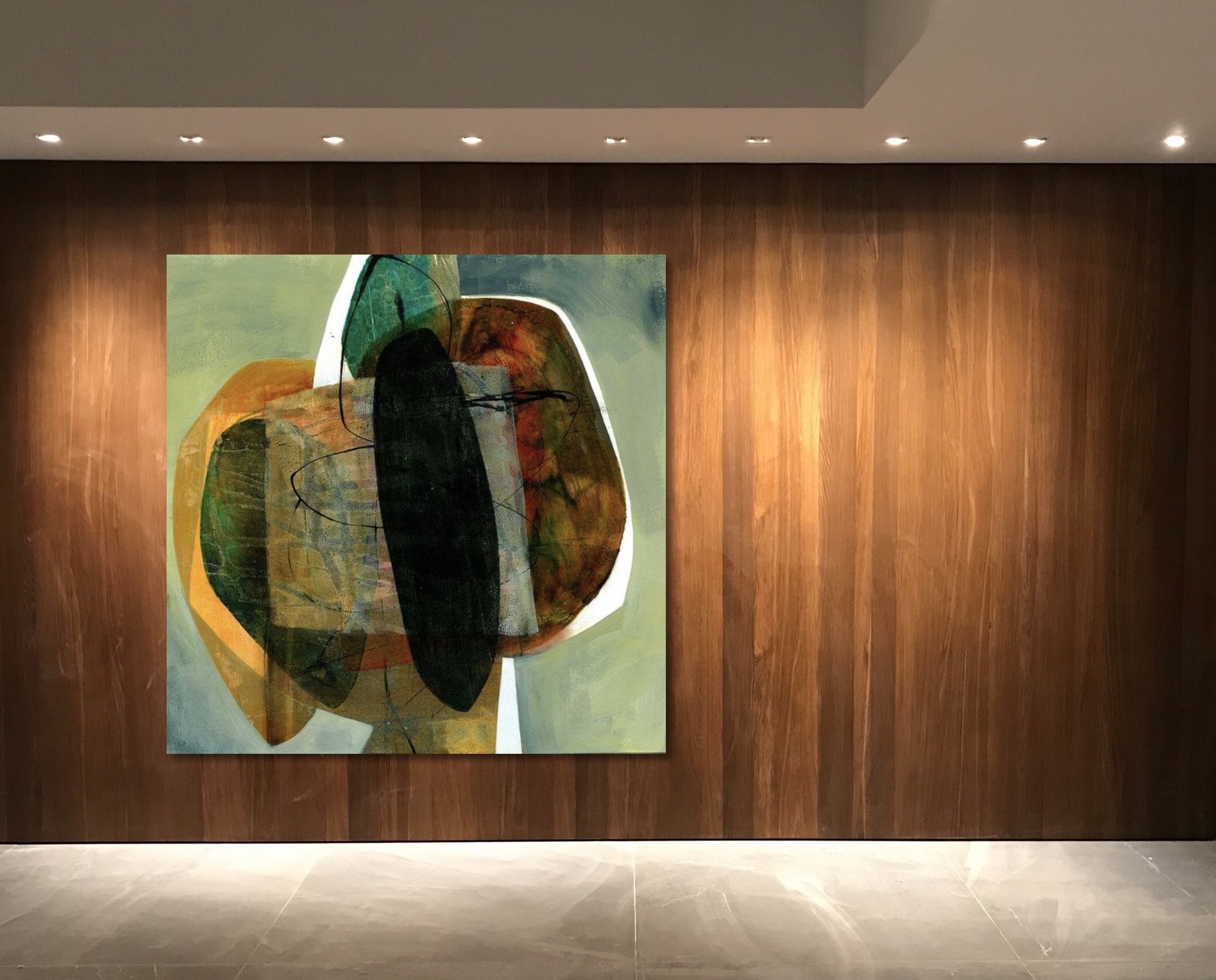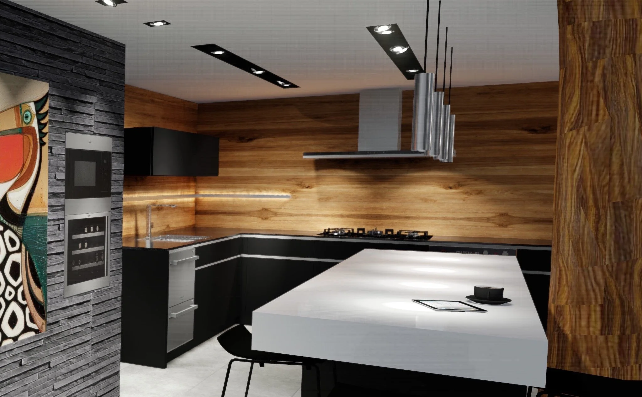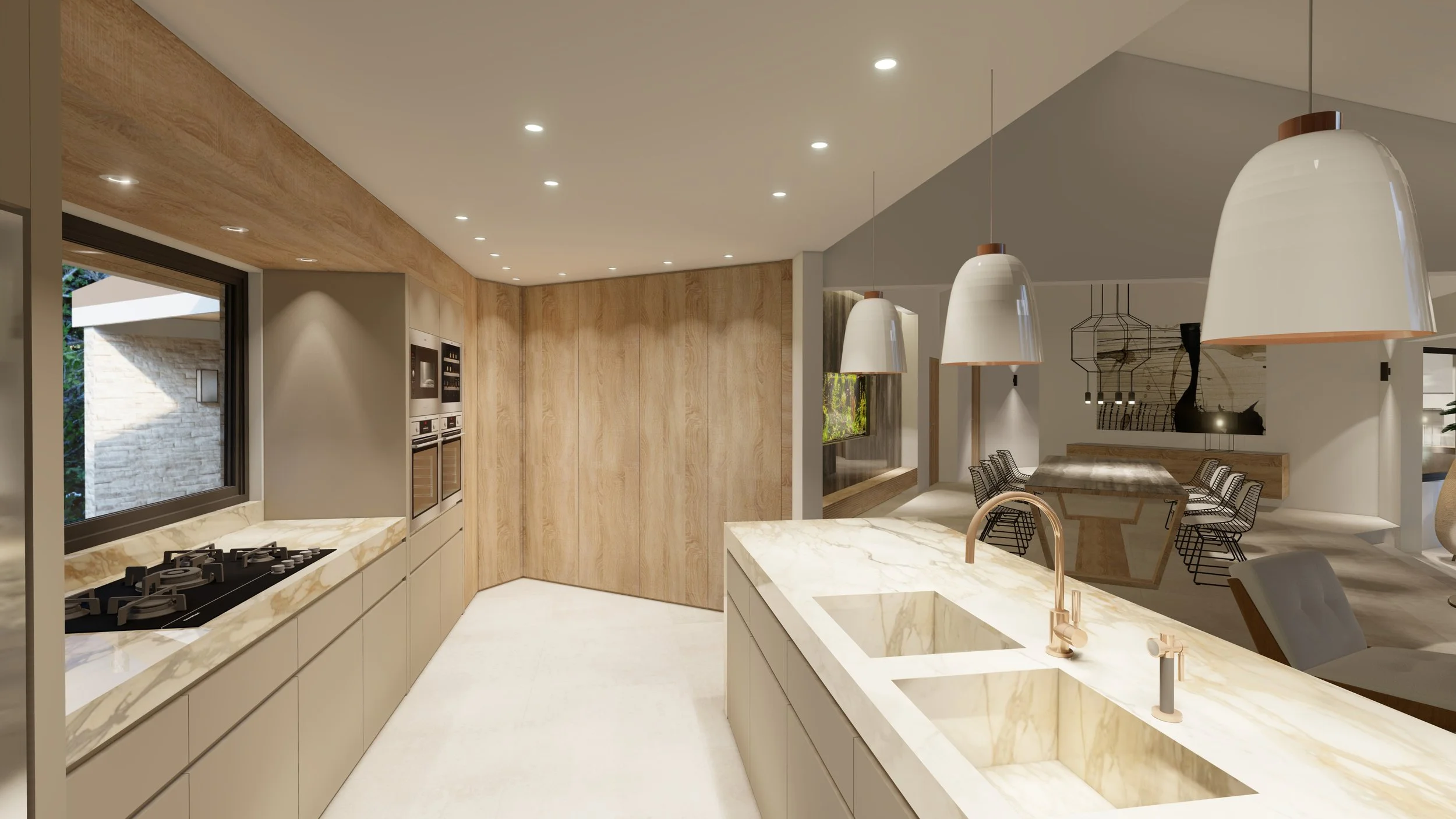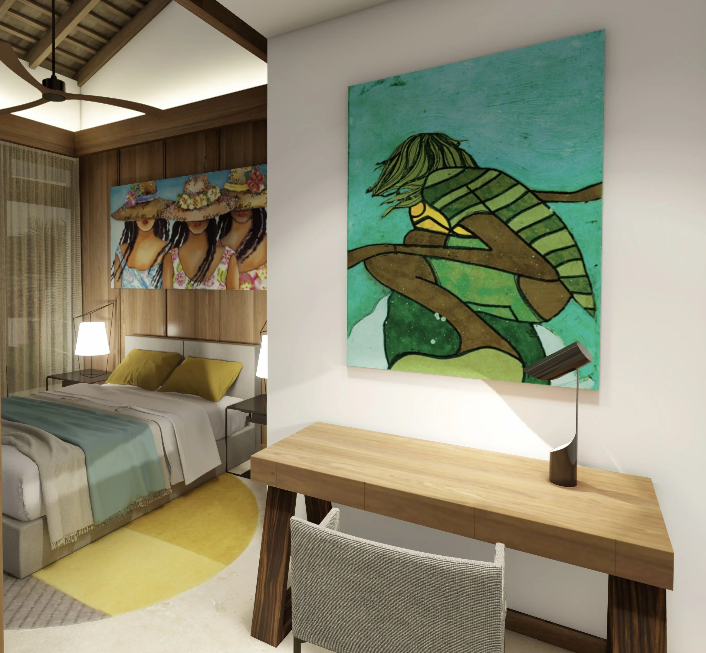 Les marbres brun Frappuccino, ivoire Calacatta vena vecchia, et les essences de bois clairs composent une toile apaisante, rythmée par des contrastes forts comme le marbre noir Sahara des îlots et de la table monumentale. Les œuvres d’art, aux couleurs vibrantes et aux accents polynésiens, insufflent une dimension culturelle et émotionnelle à l’espace.
