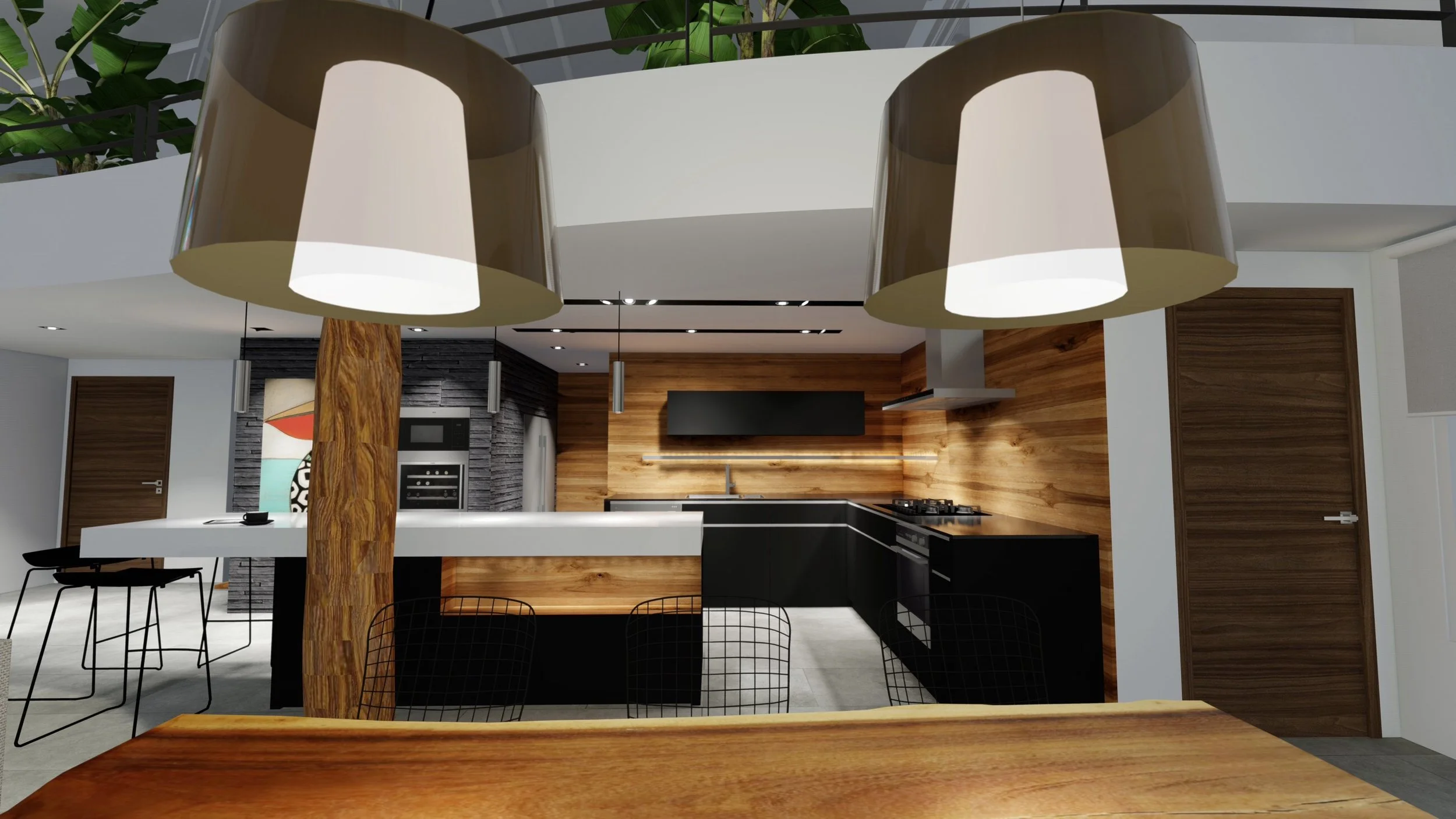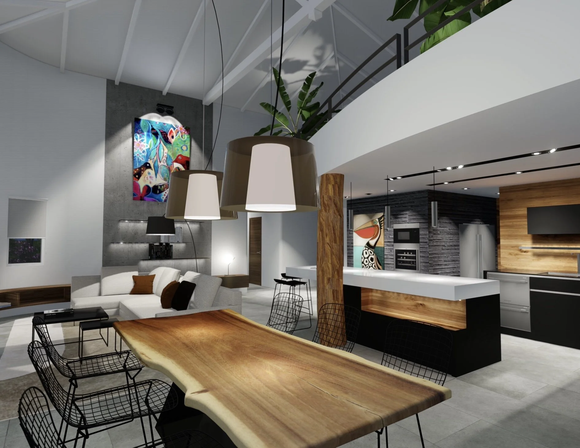 Ambiance urbaine créative avec un côté loft tropical mélange de matériaux bruts, bois, métal, béton, mobilier aux lignes épurées, touches noires graphiques, tables, chaises, luminaires, grandes plantes tropicales, oeuvres d’art colorée.