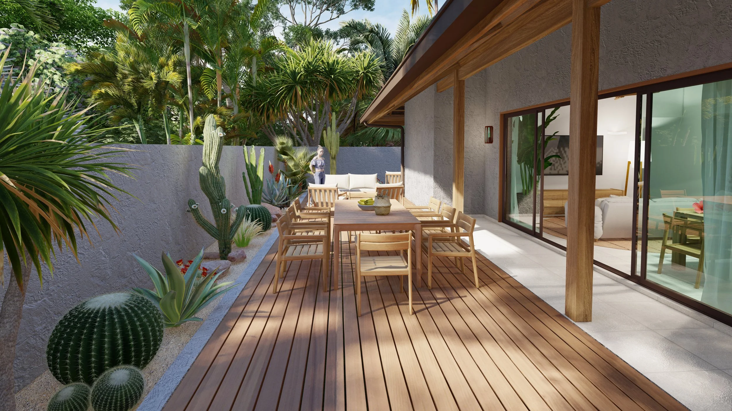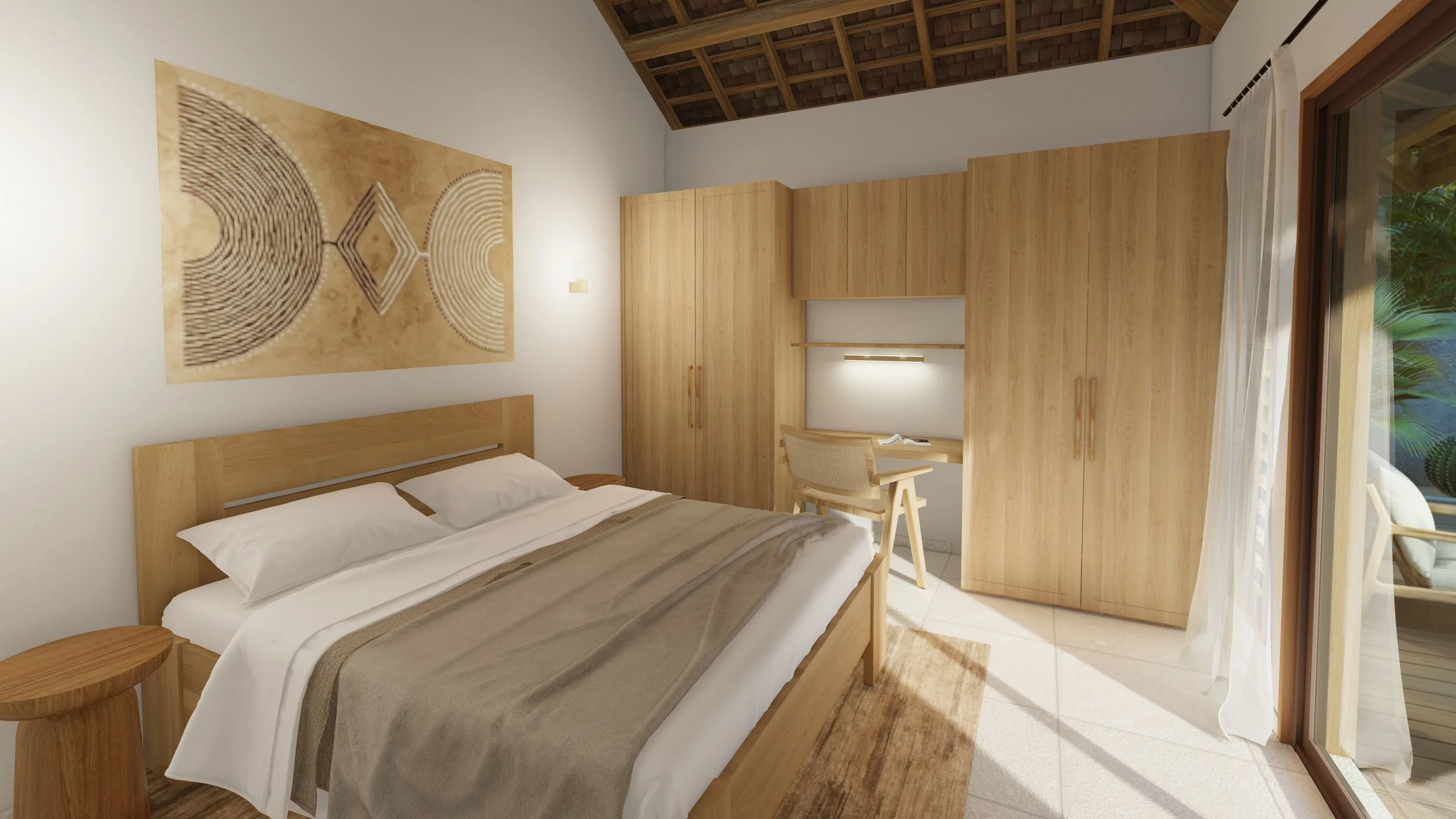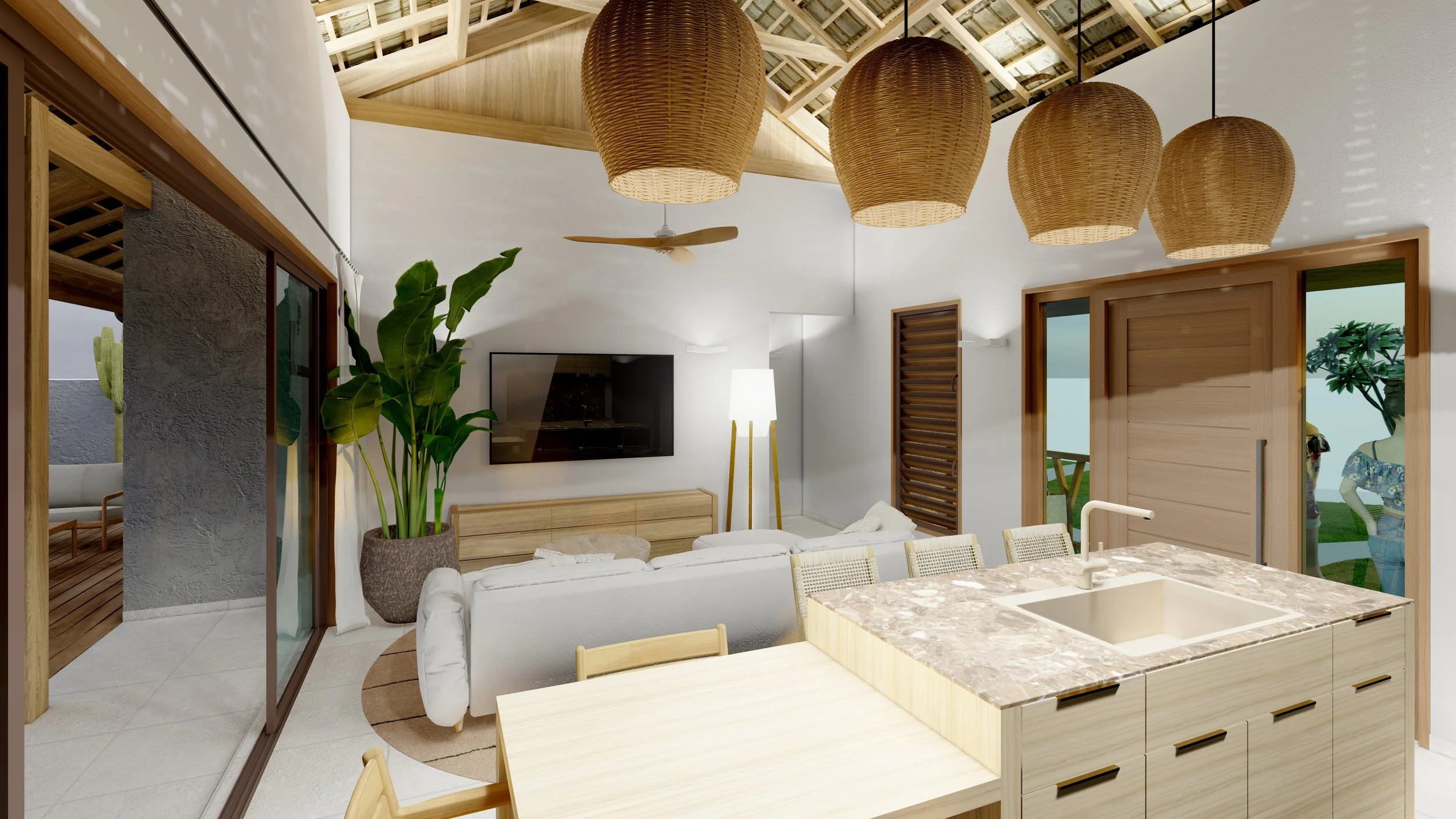 L’intérieur, baigné de lumière grâce aux larges baies vitrées, s’ouvre largement sur la terrasse et le jardin tropical, effaçant la frontière entre dedans et dehors. Le bois clair, les fibres naturelles et les teintes sable créent une atmosphère chaleureuse, apaisante et intemporelle.