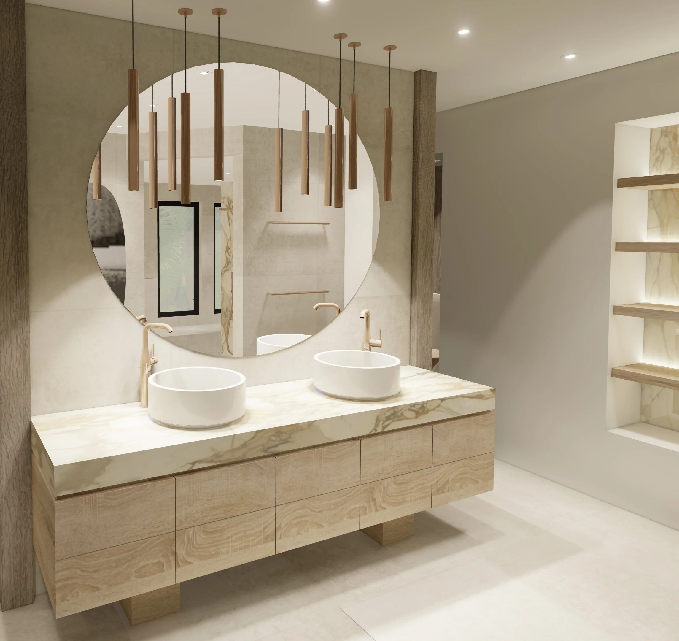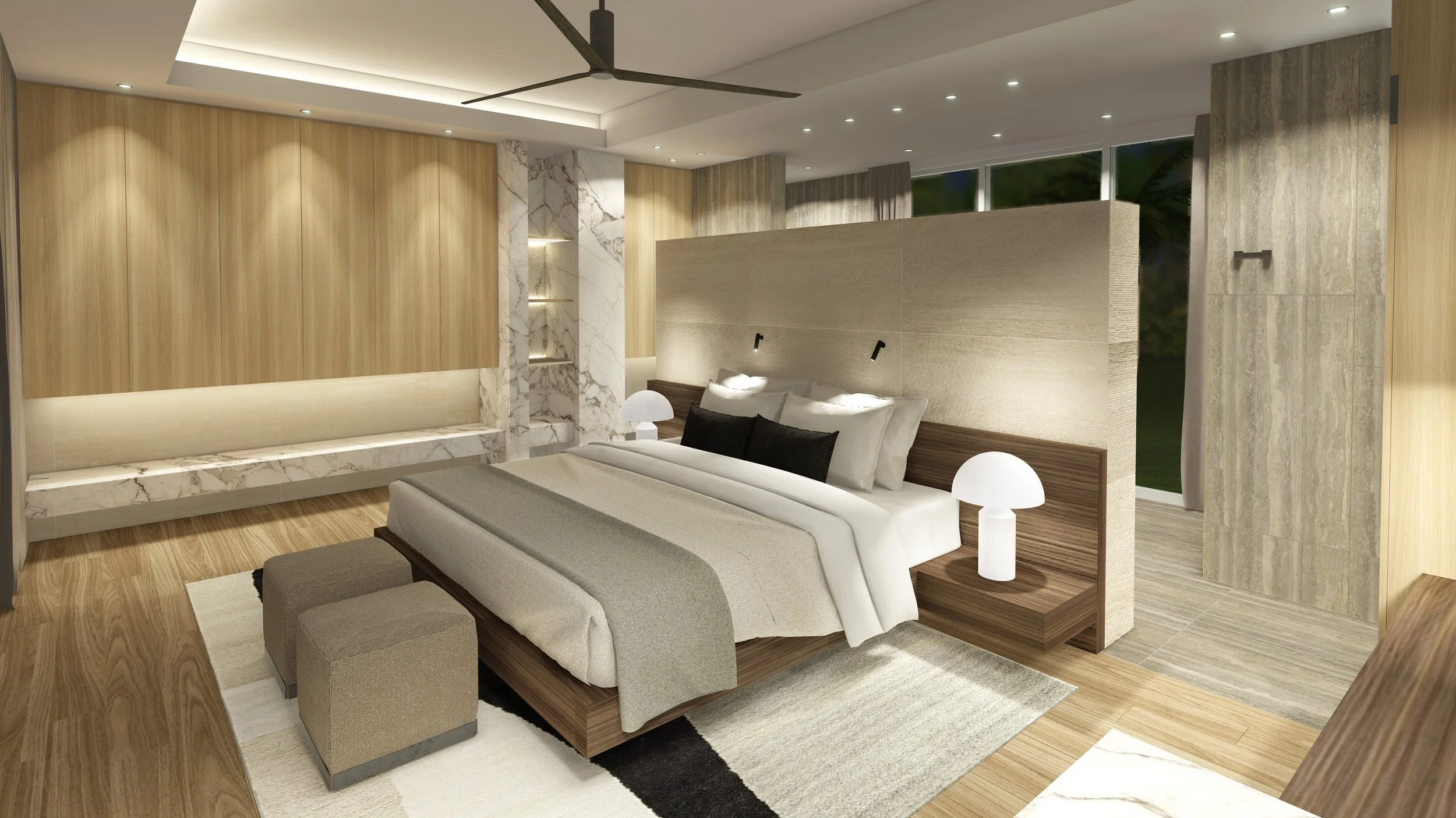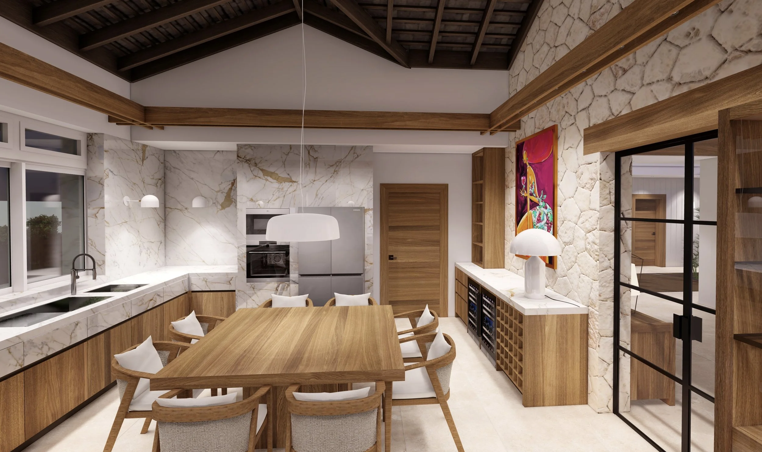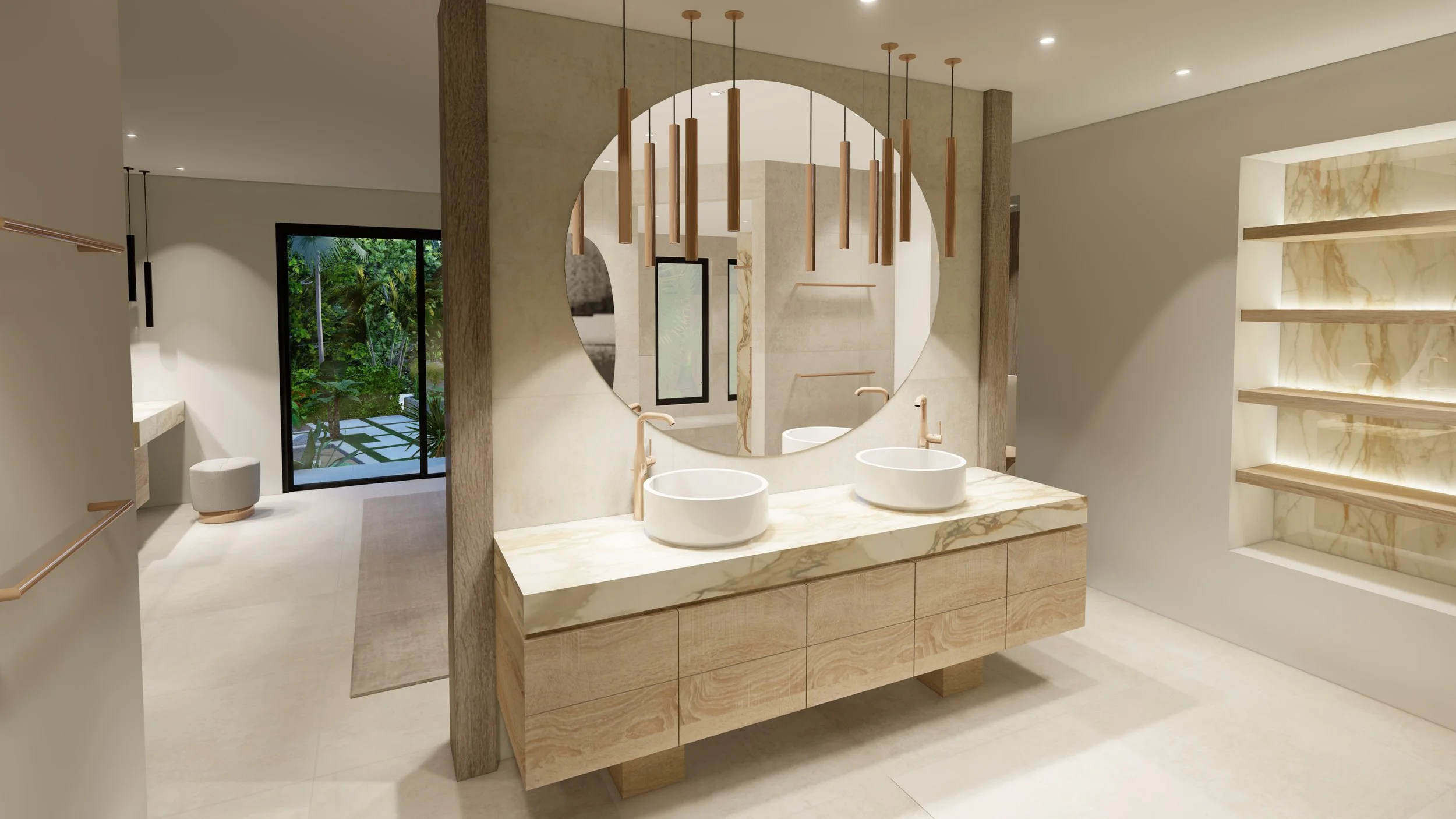 Le marbre, décliné en teintes claires et veinées, dialogue avec des bois chaleureux aux nuances douces, créant un contraste subtil entre raffinement et naturel. Les grandes baies vitrées prolongent les intérieurs vers la végétation tropicale, offrant une continuité harmonieuse entre dedans et dehors.