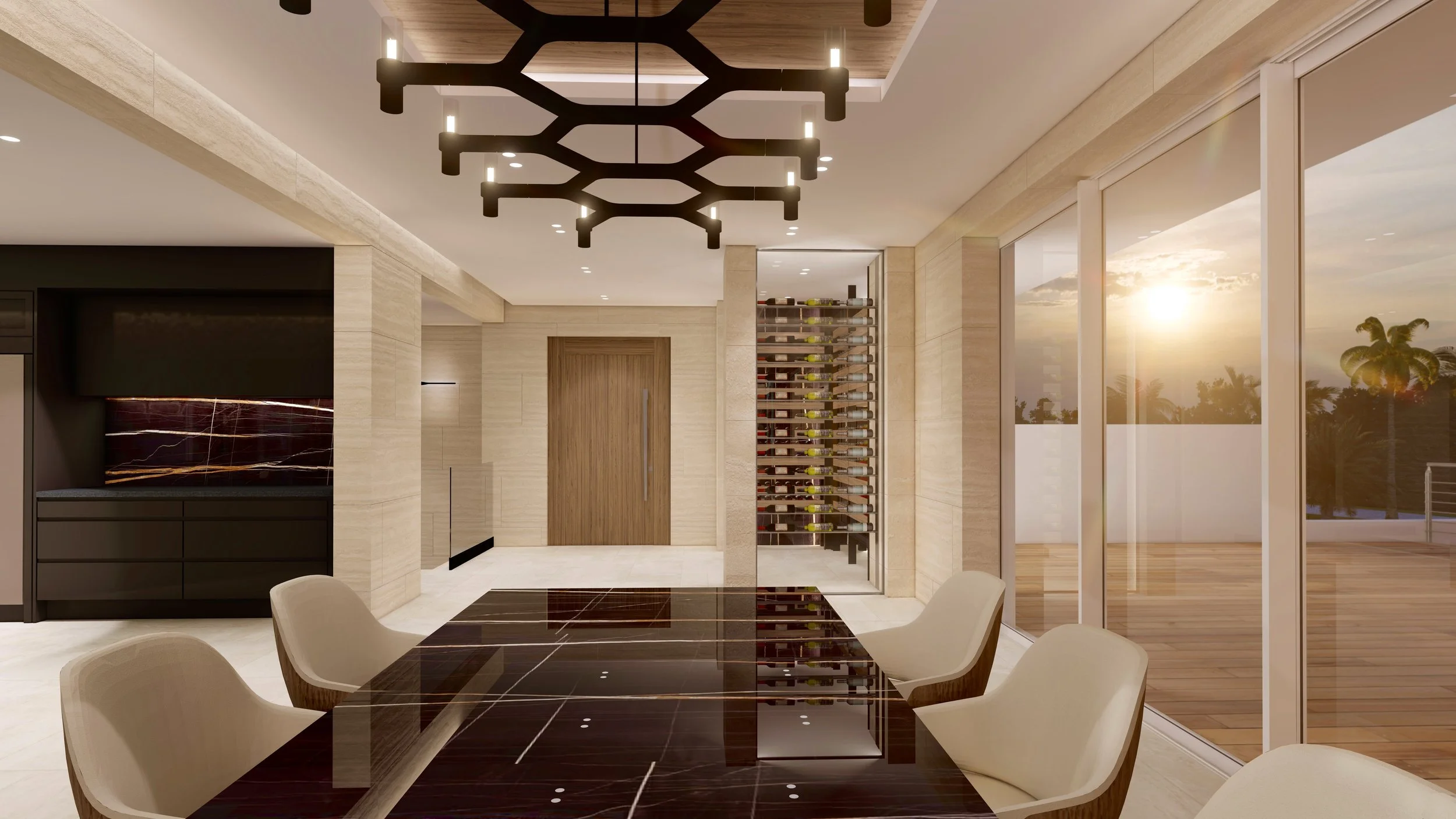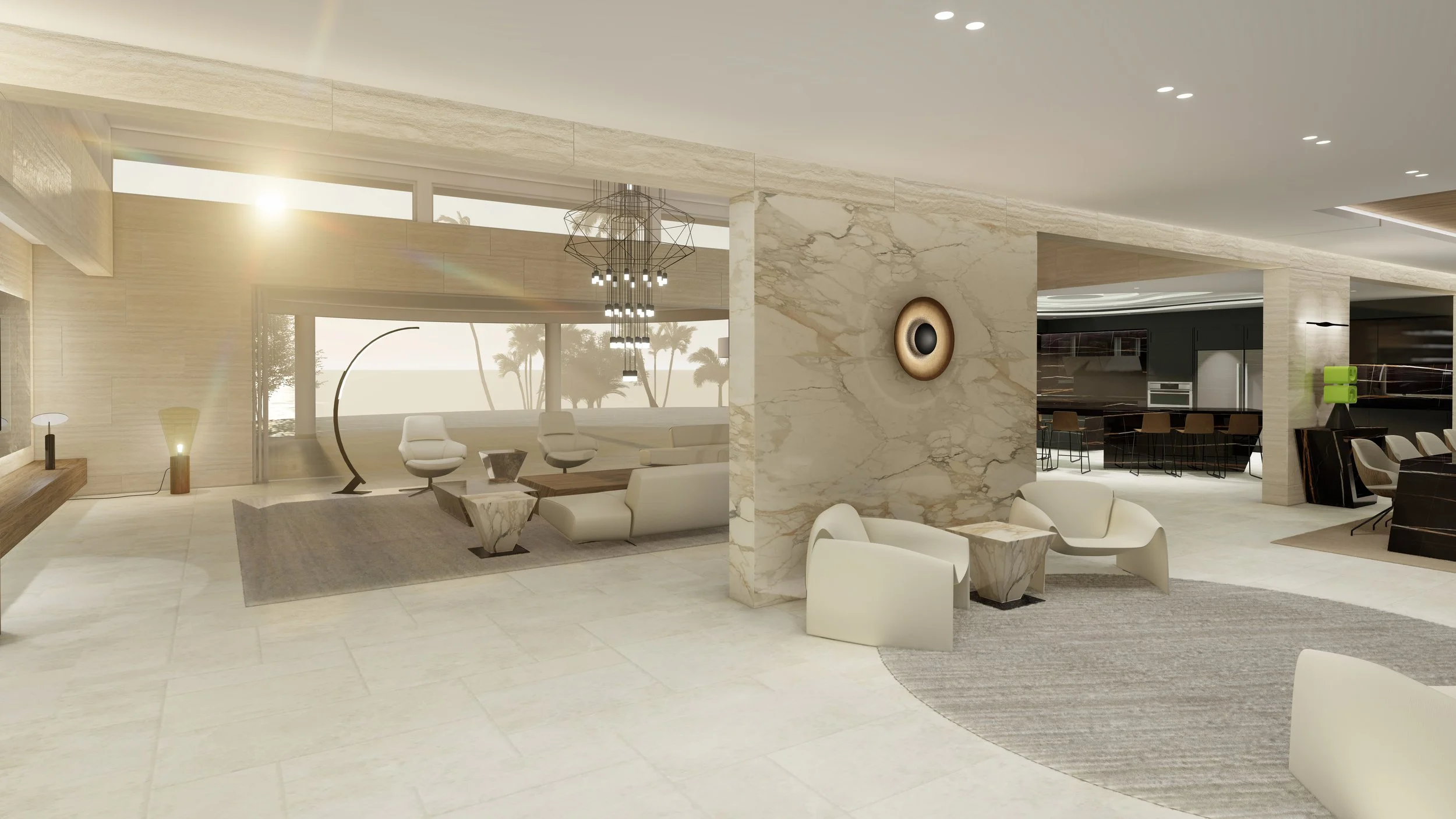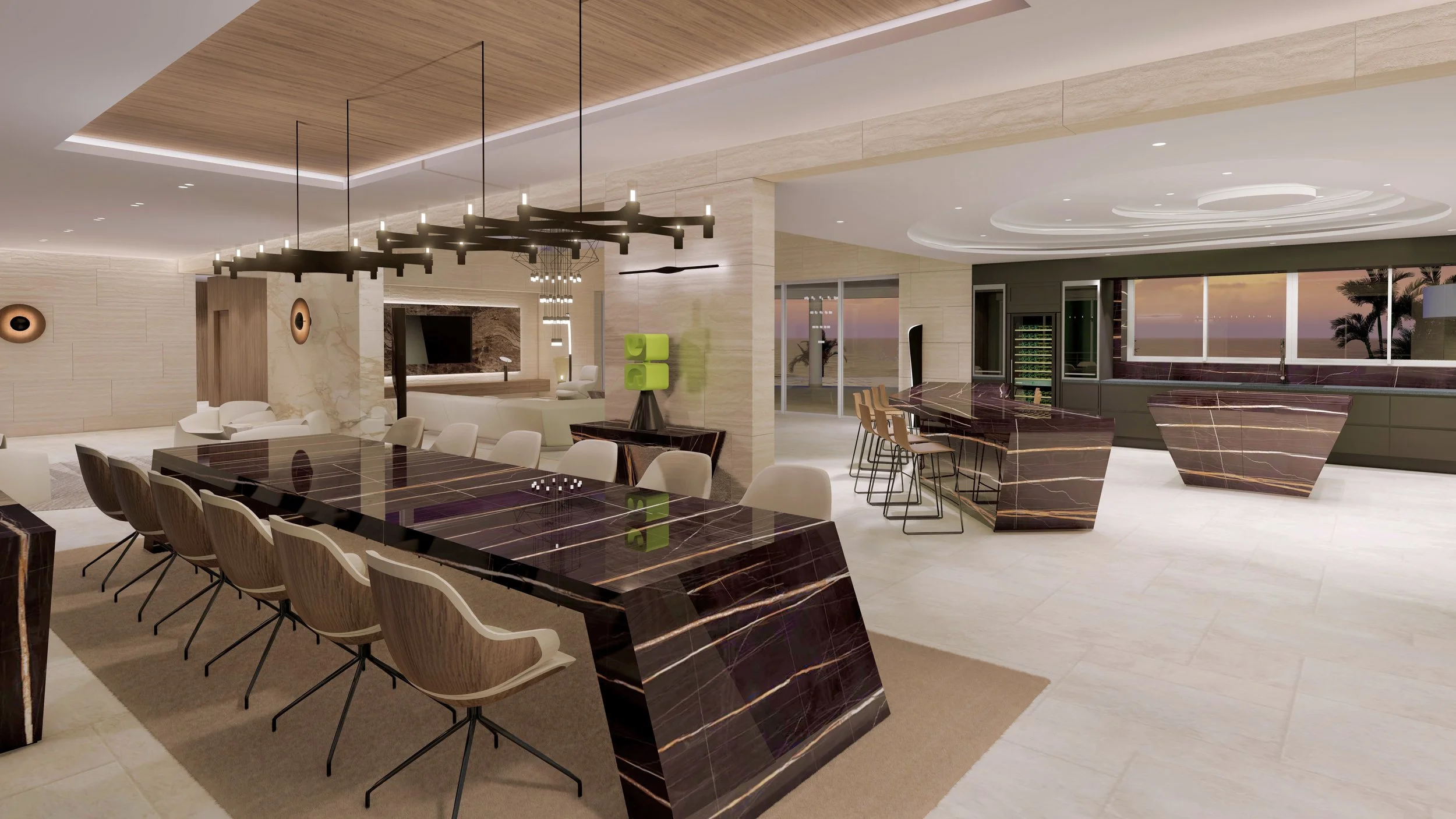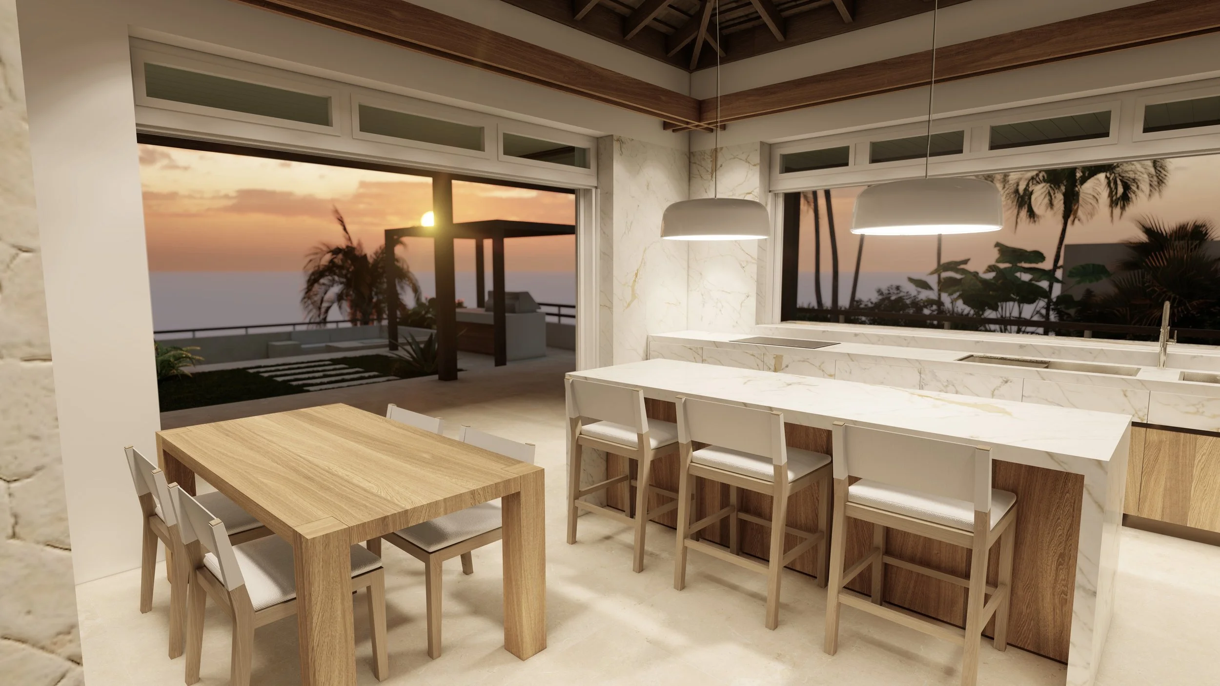 Le marbre, décliné en teintes claires et veinées, dialogue avec des bois chaleureux aux nuances douces, créant un contraste subtil entre raffinement et naturel. Les grandes baies vitrées prolongent les intérieurs vers la végétation tropicale, offrant une continuité harmonieuse entre dedans et dehors.