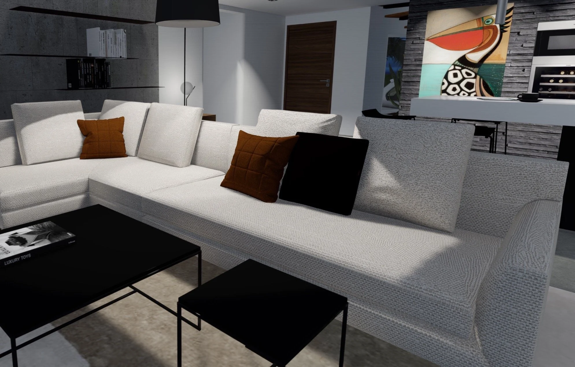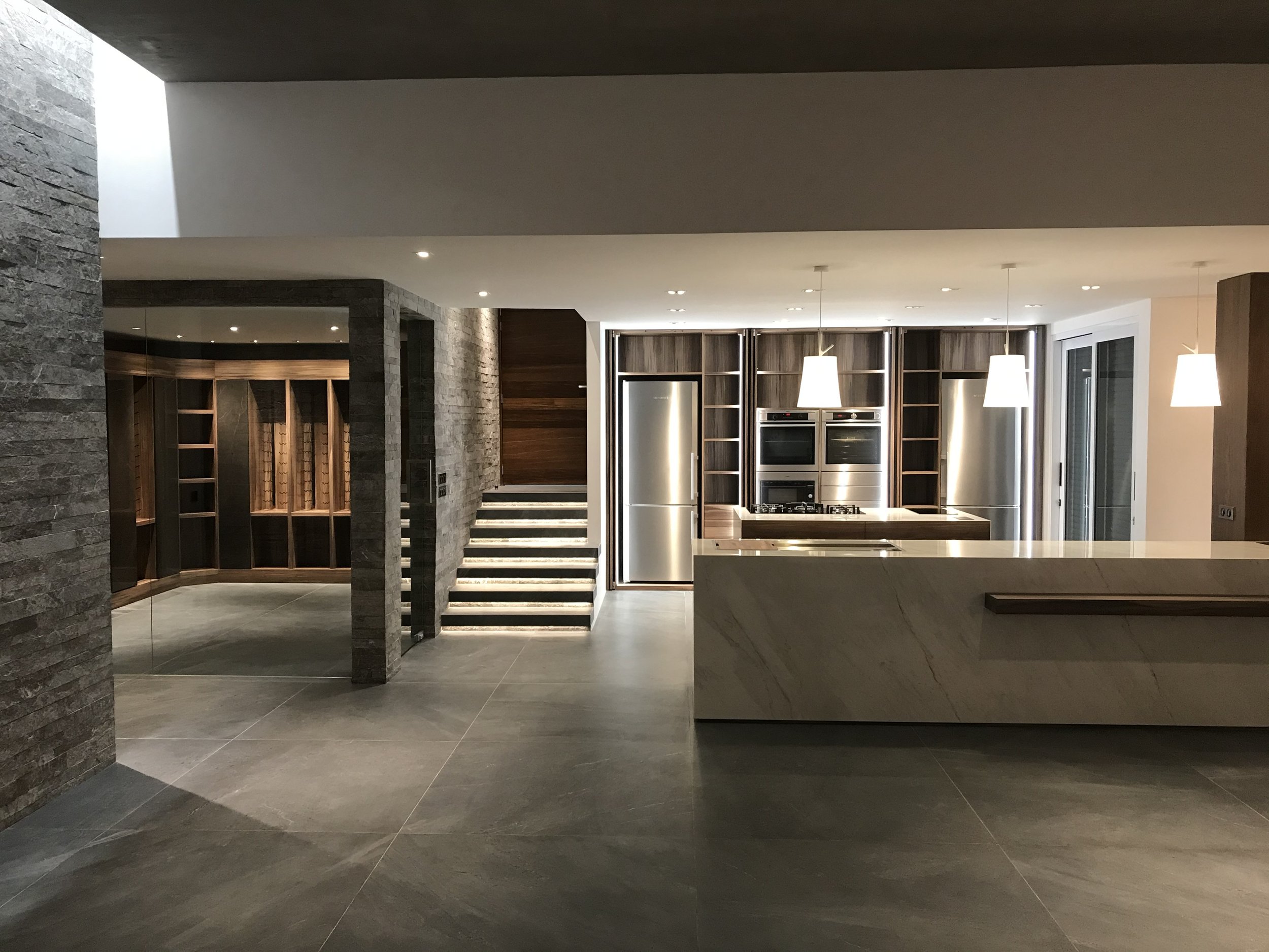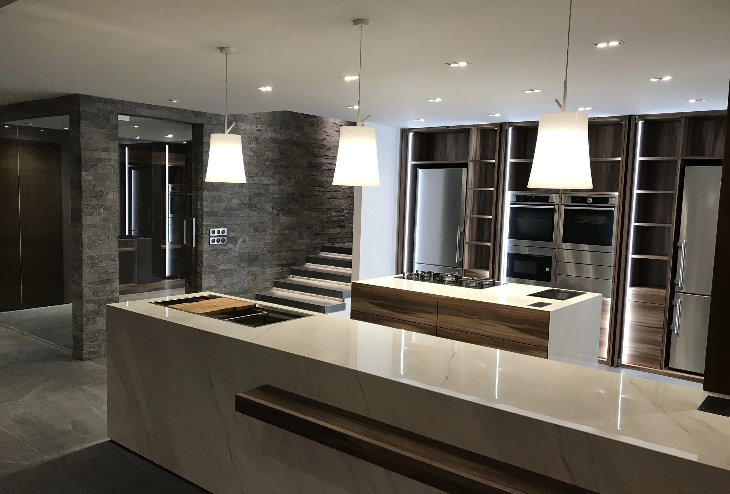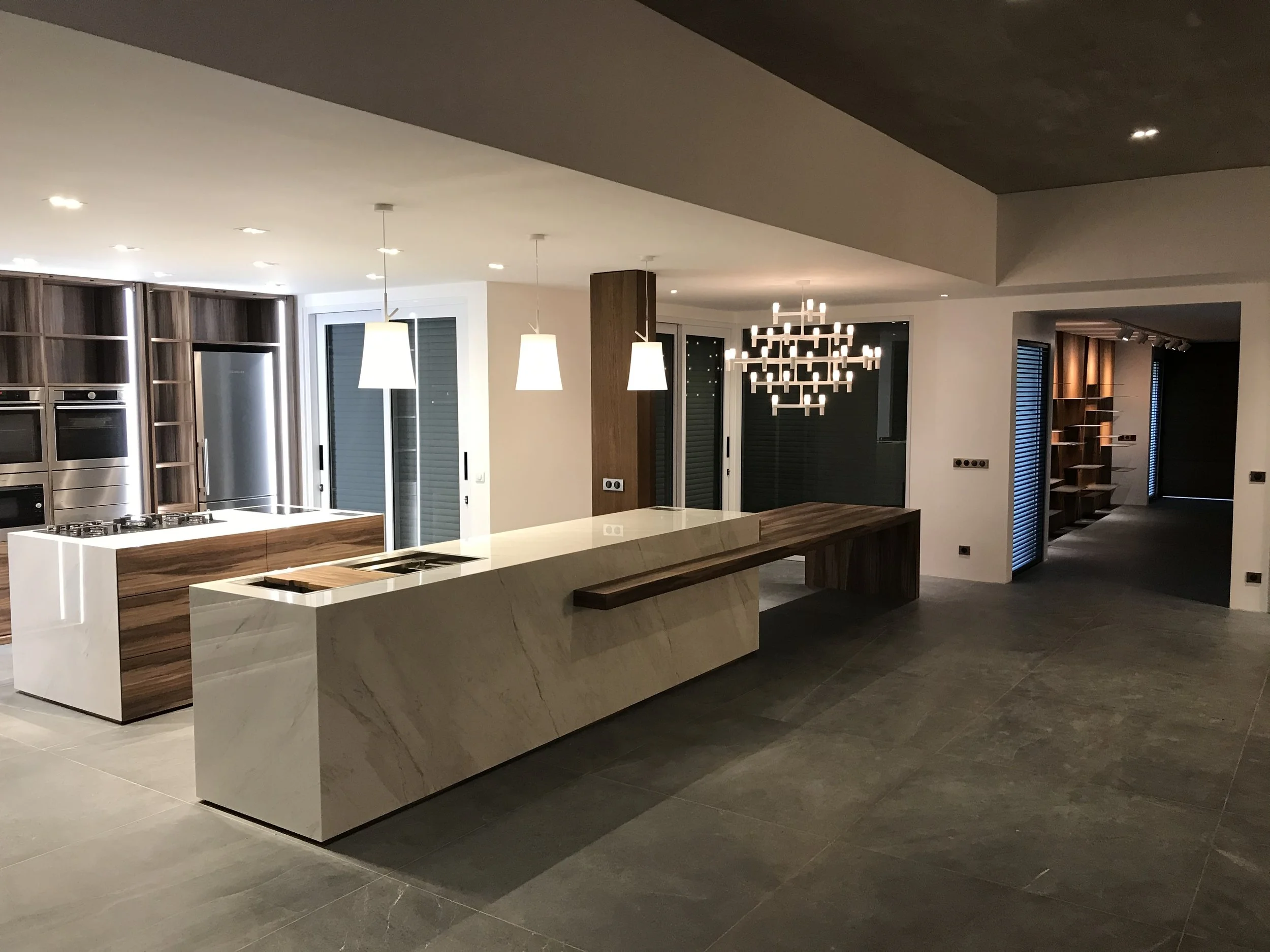 L’espace de vie s’articule autour d’une cuisine sculpturale, où le marbre et le bois s’équilibrent dans une composition graphique et raffinée. Les lignes pures de l’architecture sont adoucies par des touches artistiques : luminaires design, tableaux colorés, pièces artisanales mises en valeur par un éclairage discret.