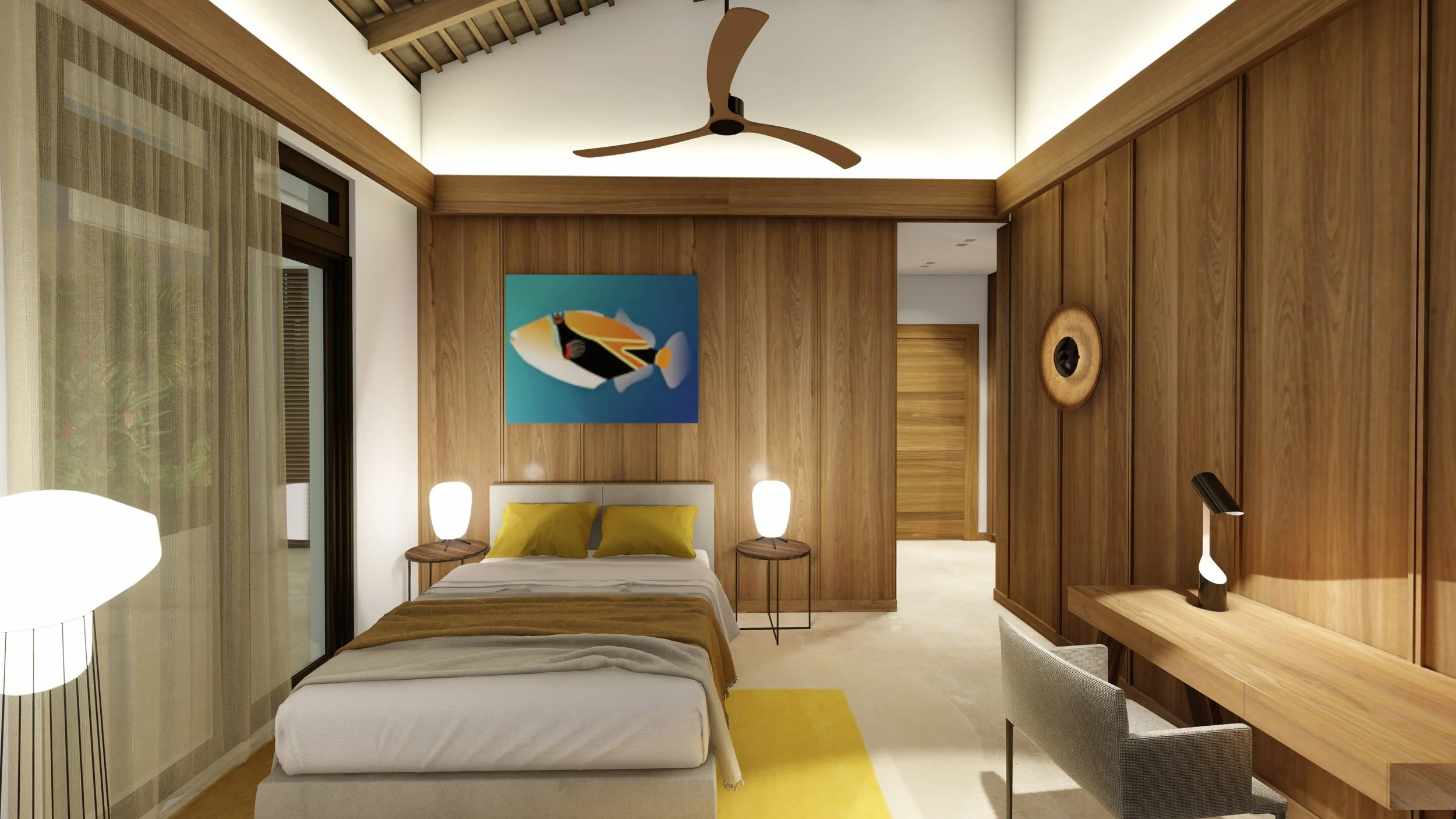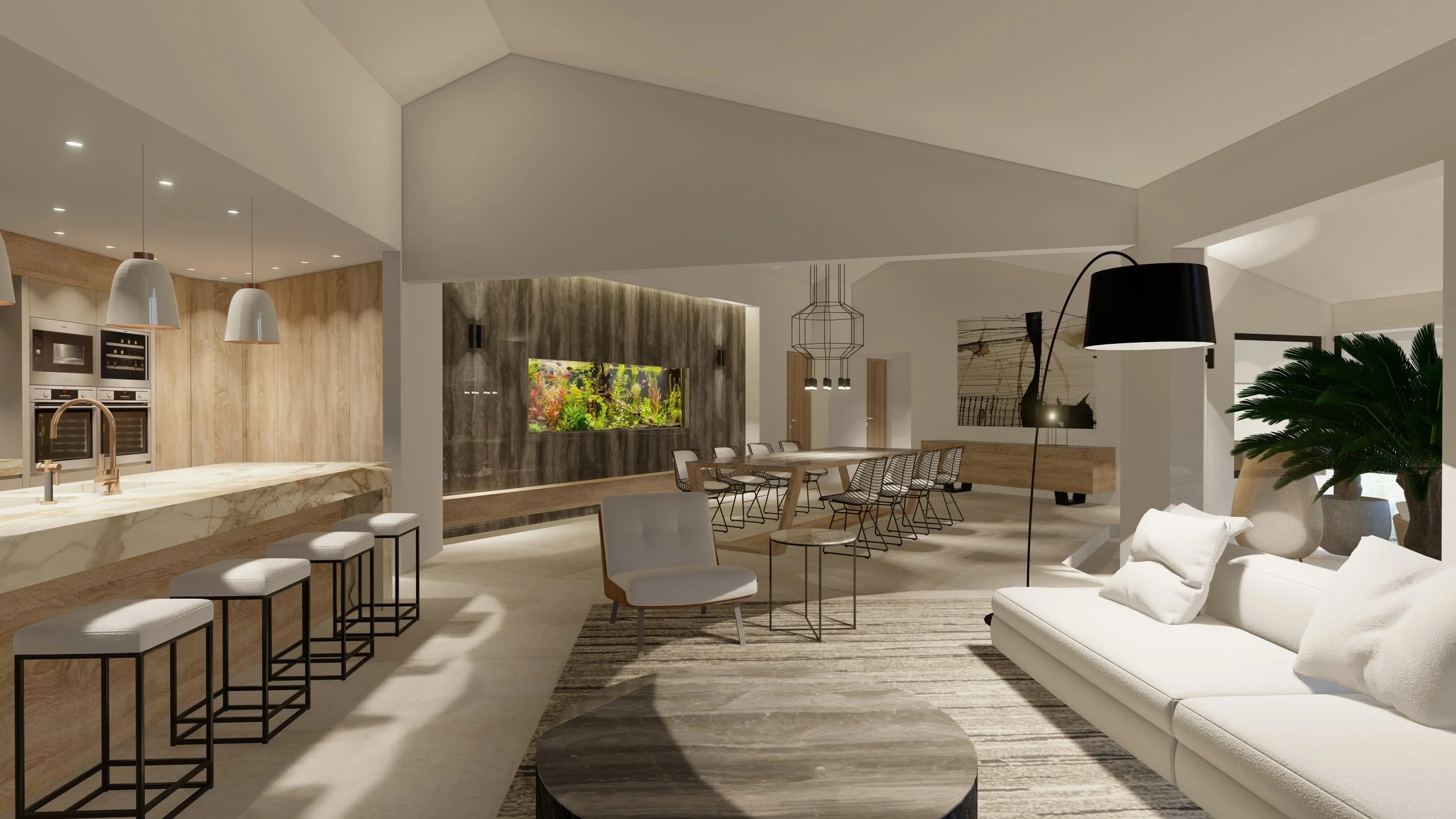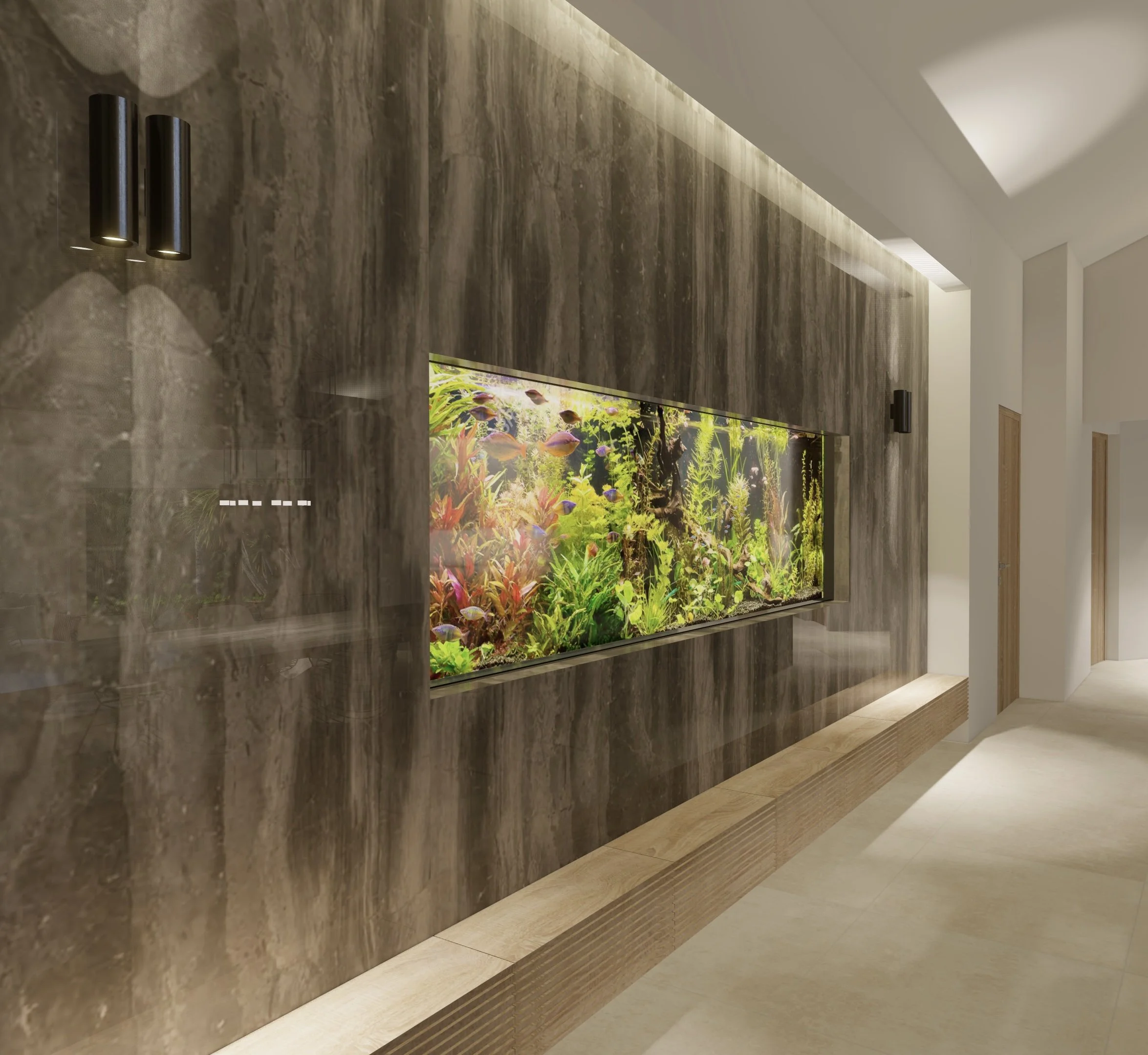 Cette villa est une ode à la nature et à la lumière. Au cœur de ses volumes ouverts, un aquarium majestueux s’élève comme un lagon intérieur, vibrant de couleurs et de vie. Il déploie un univers aquatique inspiré des récifs polynésiens, où la faune et la flore exotique semble danser en apesanteur. Tout l’espace s’organise autour de ce spectacle vivant, qui diffuse une atmosphère de sérénité et d’émerveillement, transformant la maison en une véritable respiration poétique entre architecture et nature.