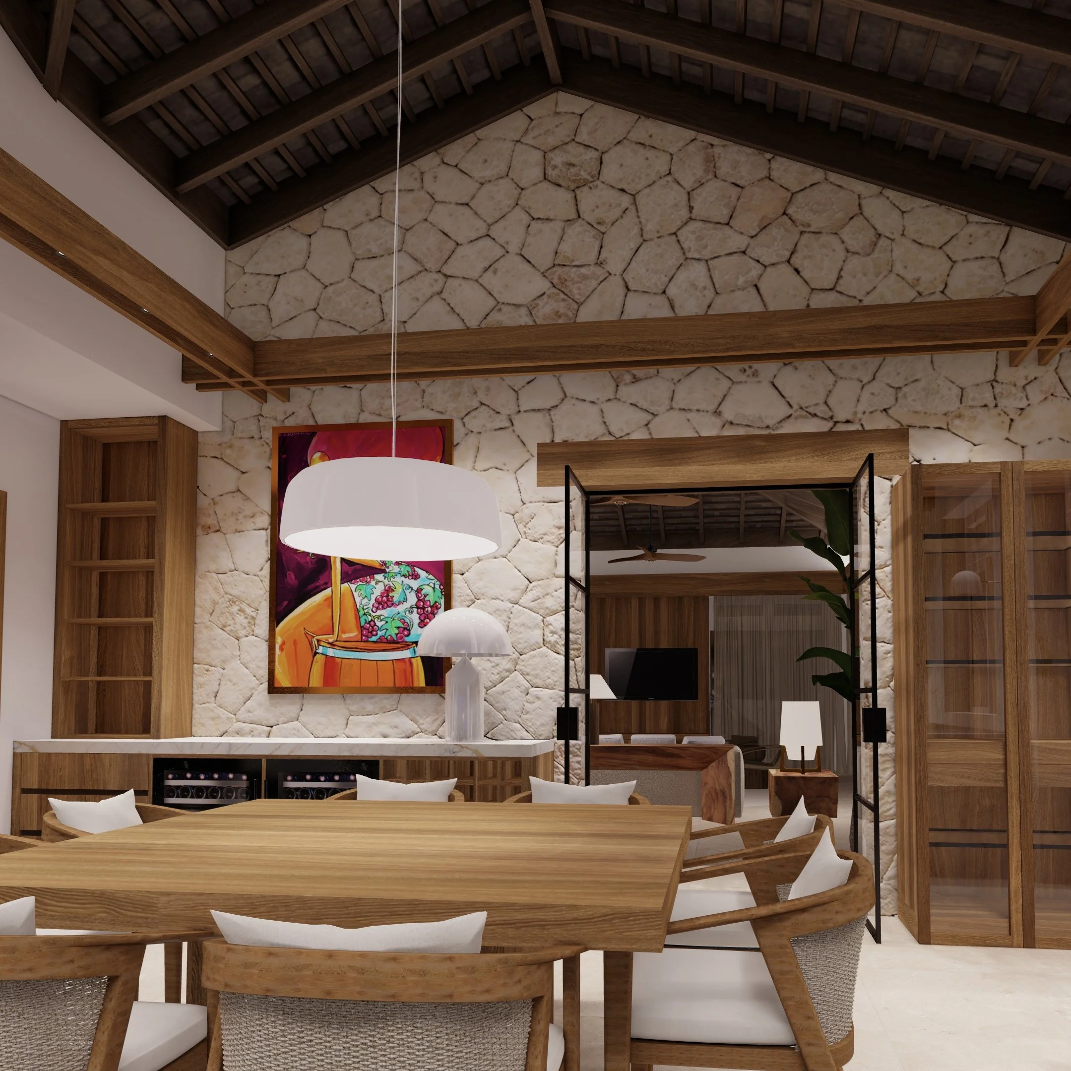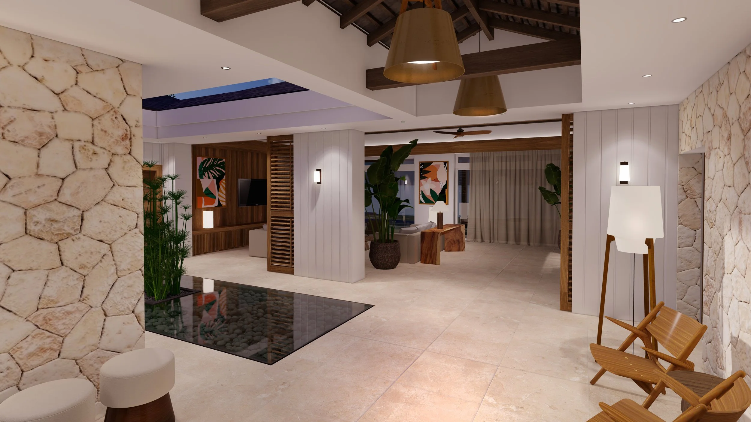 Lignes épurées, mobilier sculptural et éclairages intégrés créent une atmosphère contemporaine, où chaque détail respire la précision et la fluidité. Les vastes ouvertures prolongent l’intérieur vers l’extérieur, renforçant le lien avec la nature tropicale environnante.