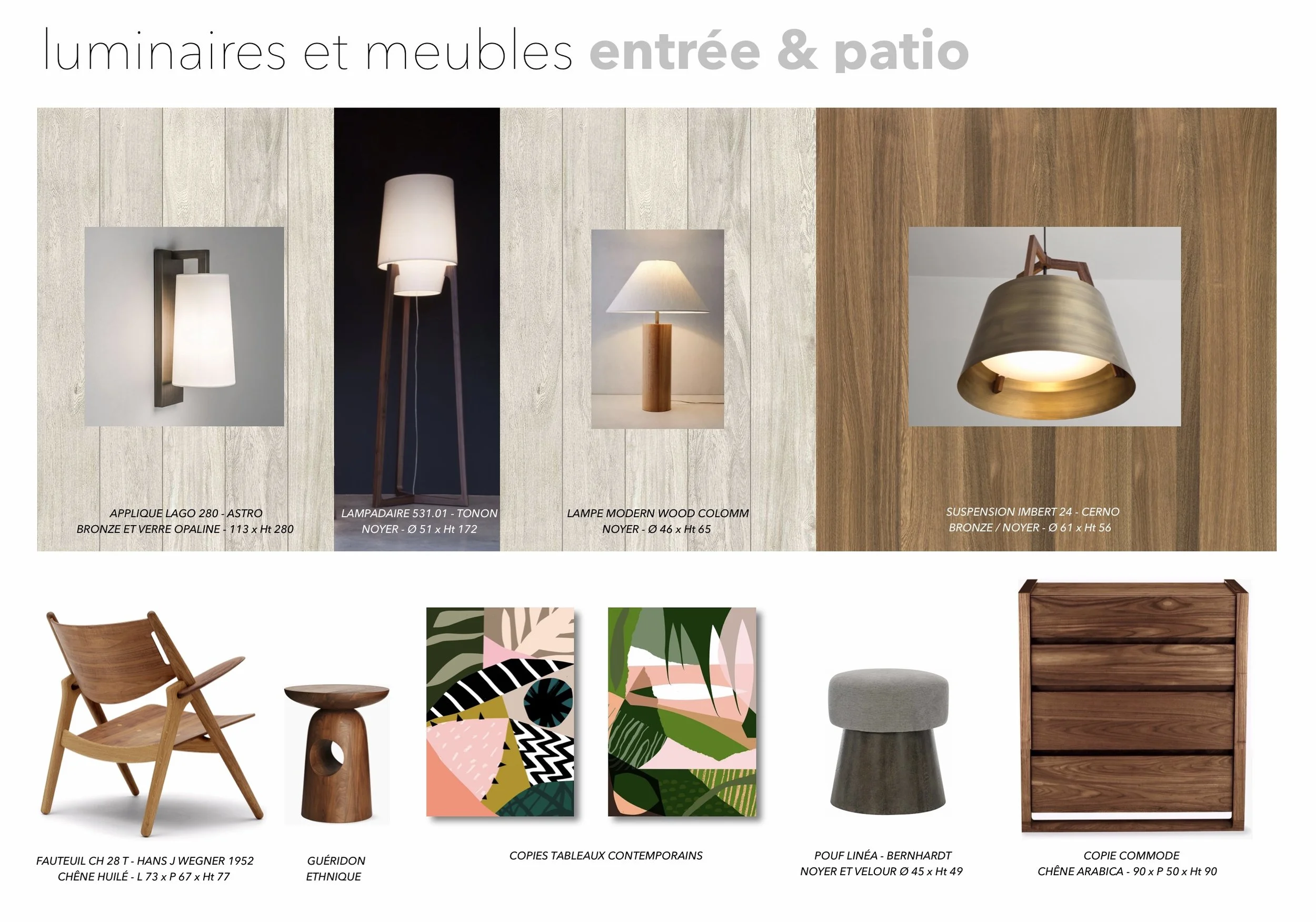 Nous sélectionnons avec soin mobiliers, luminaires, objets déco, matériaux et équipements. Ces planches d’ambiance illustrent l’esprit du projet et s’accompagnent de devis précis pour une parfaite maîtrise des choix.