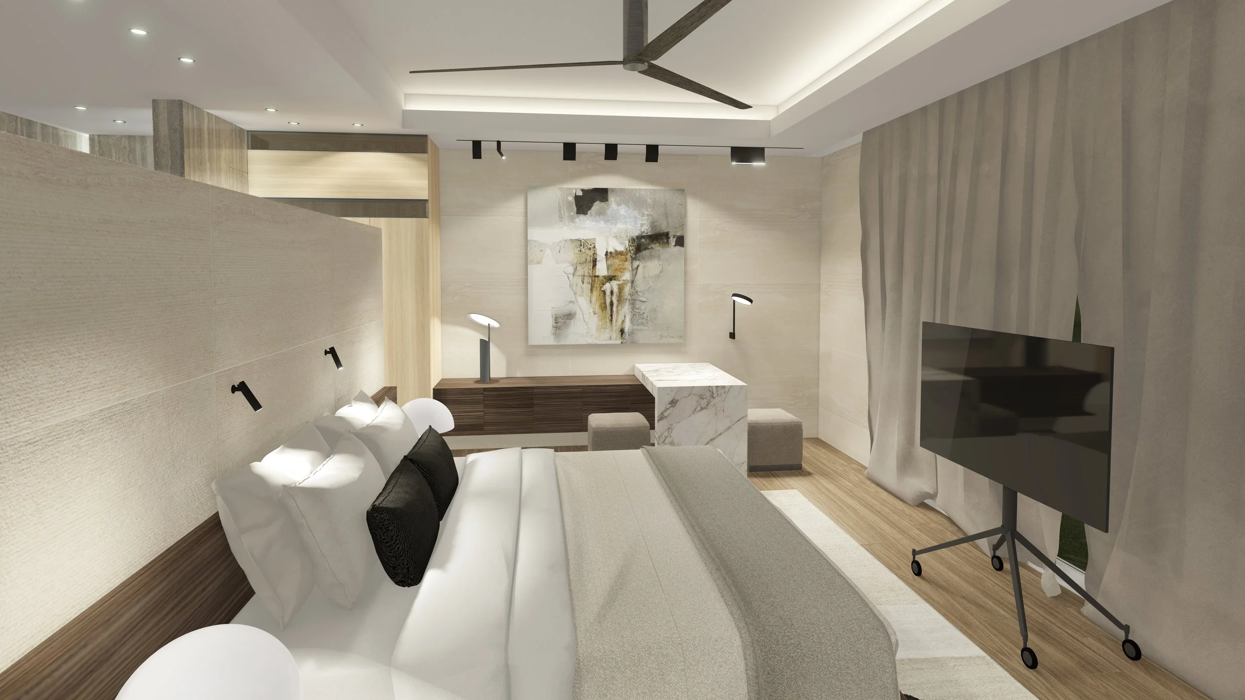 Chaque détail exprime une recherche d’équilibre : la salle de bain habillée de marbre et de bois claires veut à la fois sobre et luxueuse ; la chambre, adoucie par des textiles neutres, met en valeur une sélection artistique qui personnalise l’espace ; les luminaires graphiques et les lignes épurées du mobilier apportent une touche contemporaine sans excès.